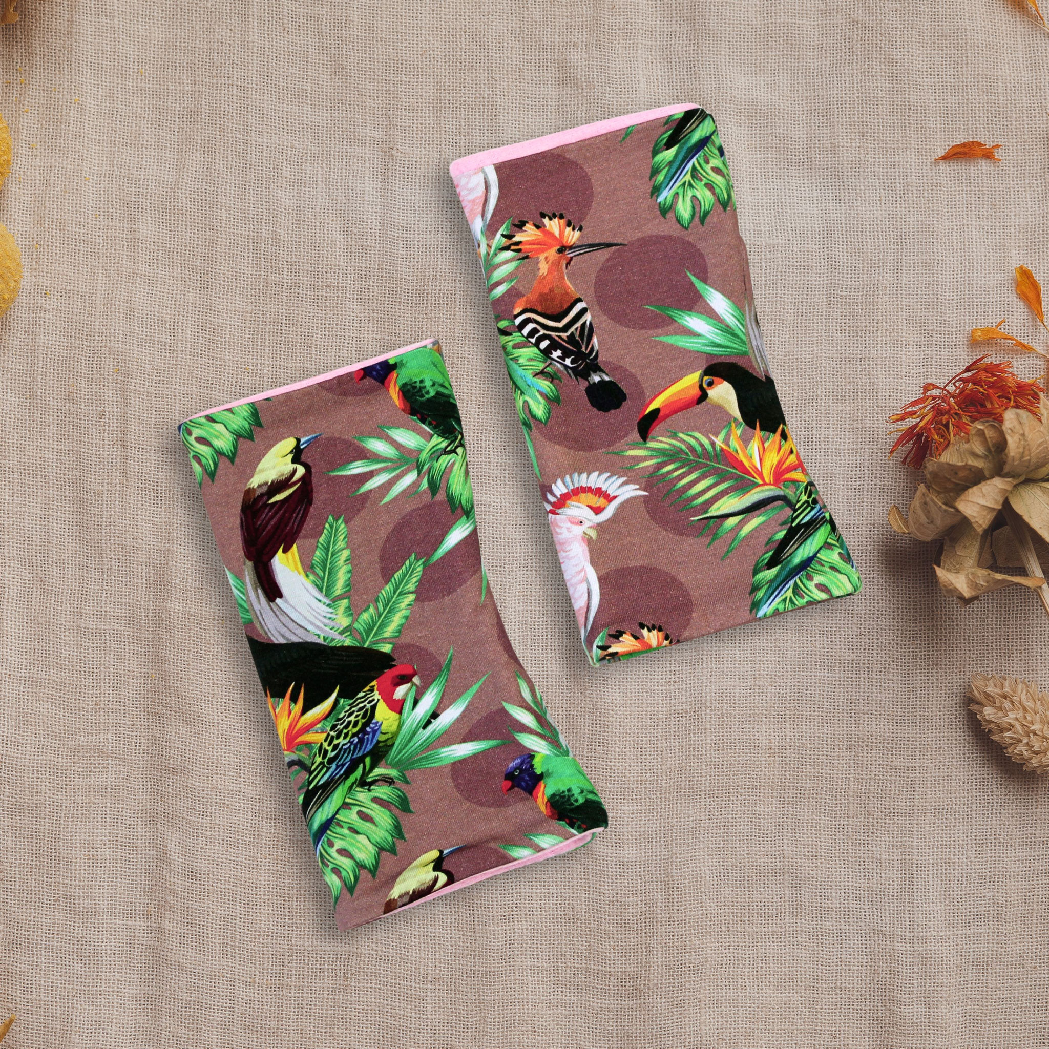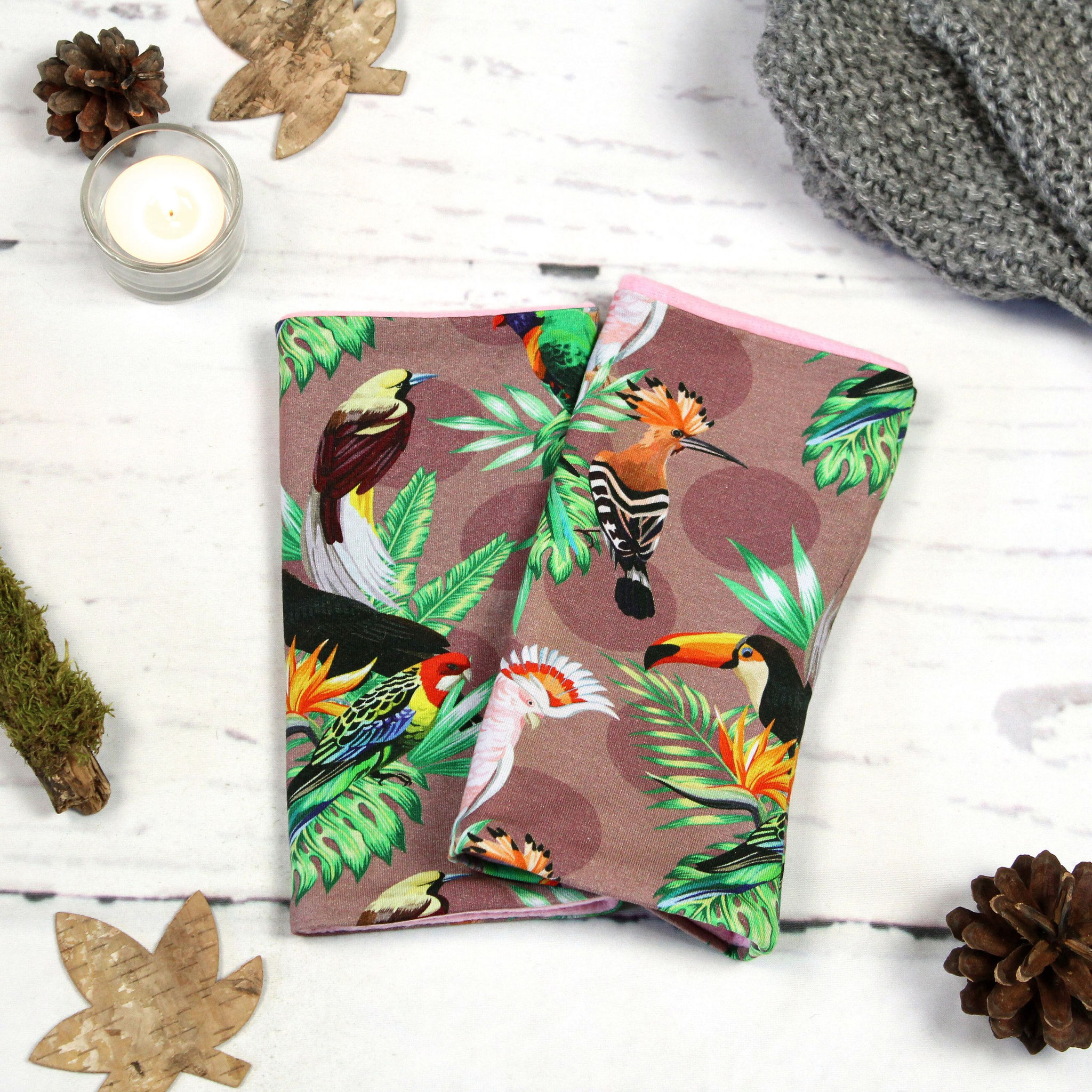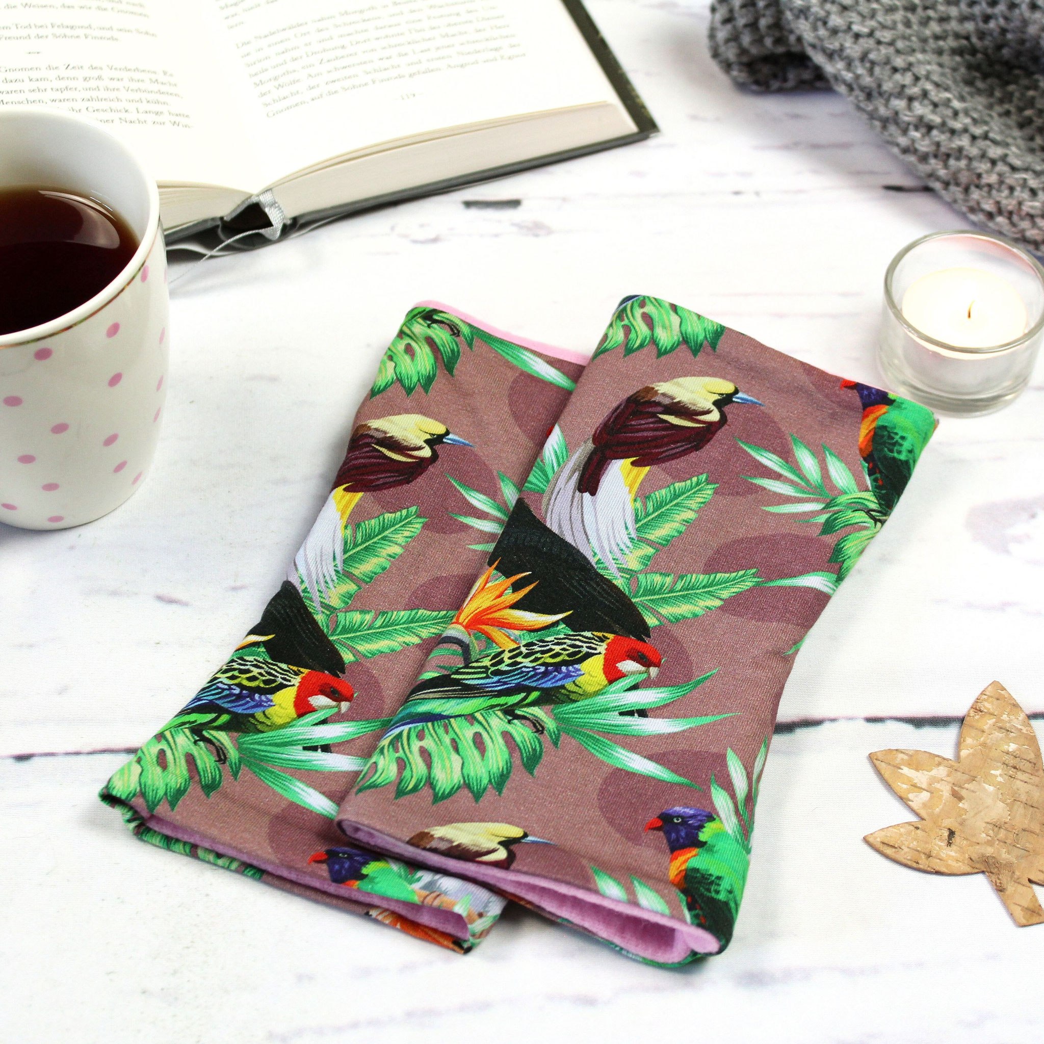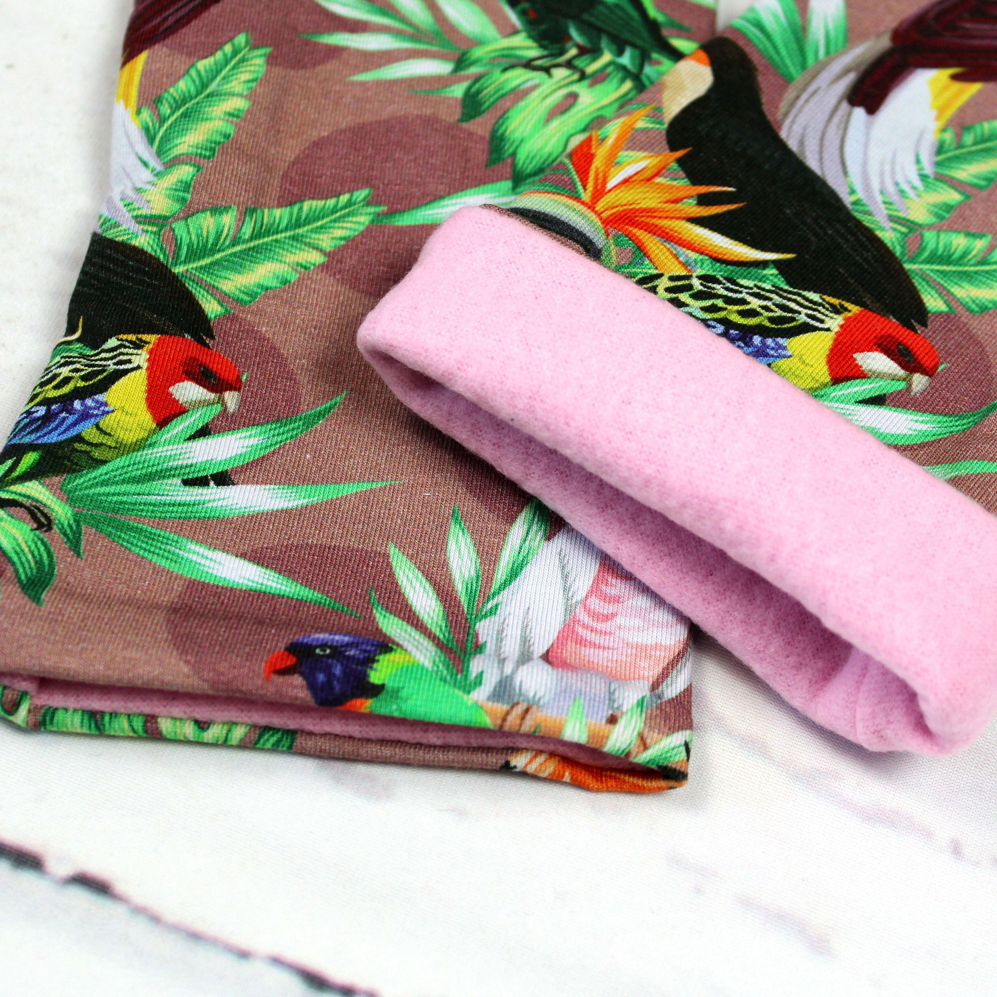 Armstulpen sind genau das Richtige für dich. Sie verbinden Funktion und Design: außen lila Jersey mit tropischen Vogelprint, innen kuschelig weiches, rosafarbenes Fleece. So bleiben deine Hände