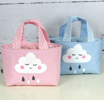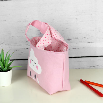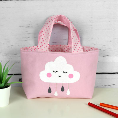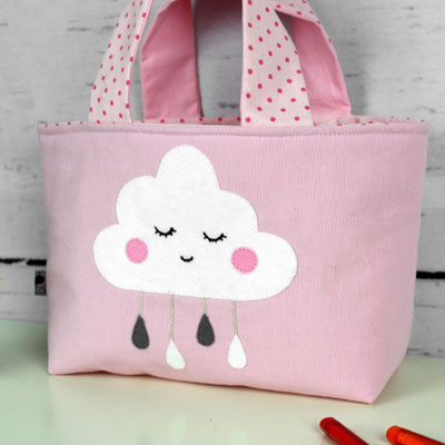 Das Täschchen wurde aus Baumwollstoff angefertigt und mit Volumenvlies gefüttert. Die hellrosa Seite wurde mit einer Wolken-Applikation aus Filz verziert. Wird das