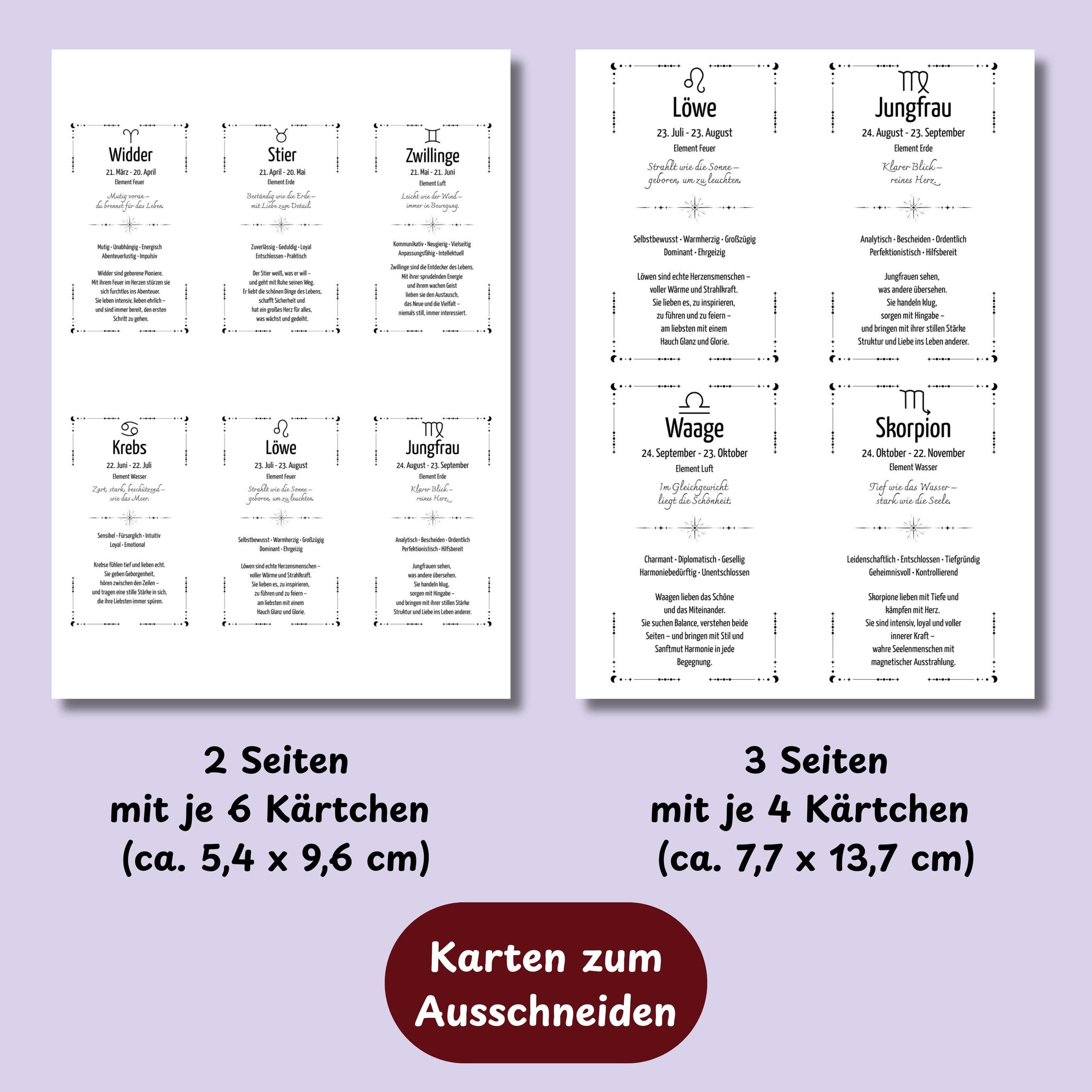 12 Sternzeichen Karten zum Ausdrucken – digitale Vorlage in 2 Größen (PDF)