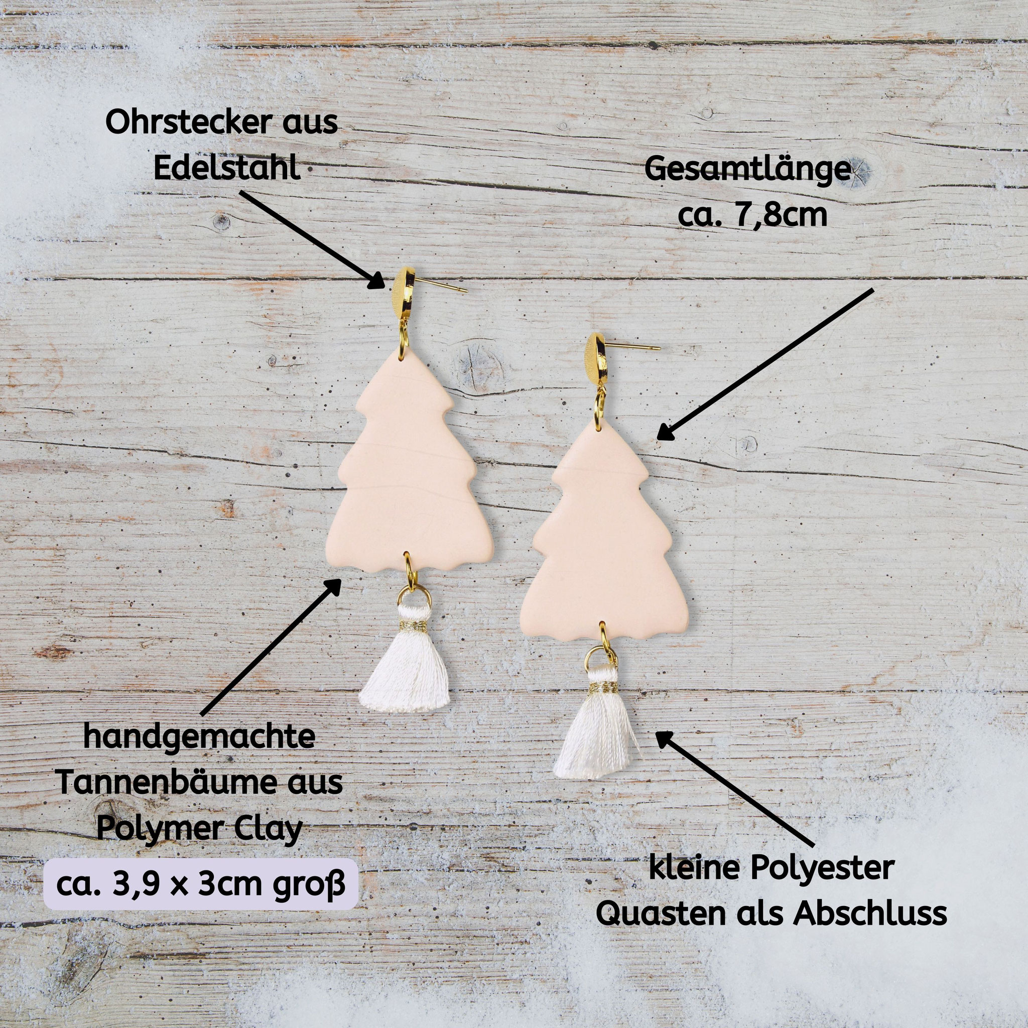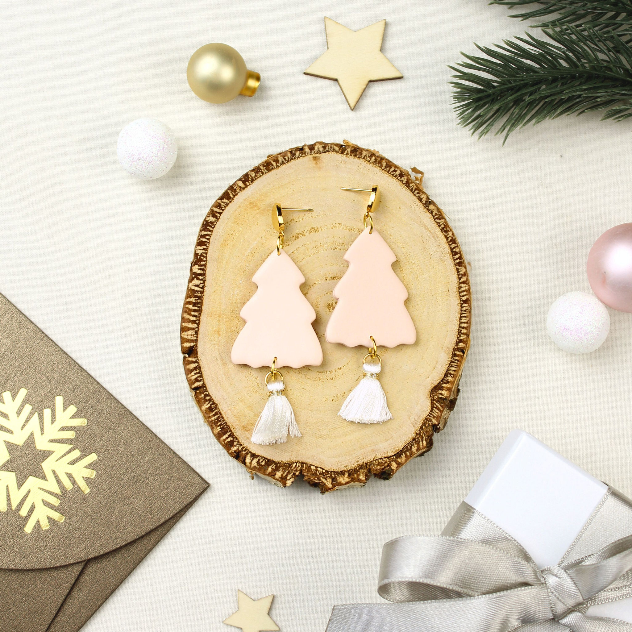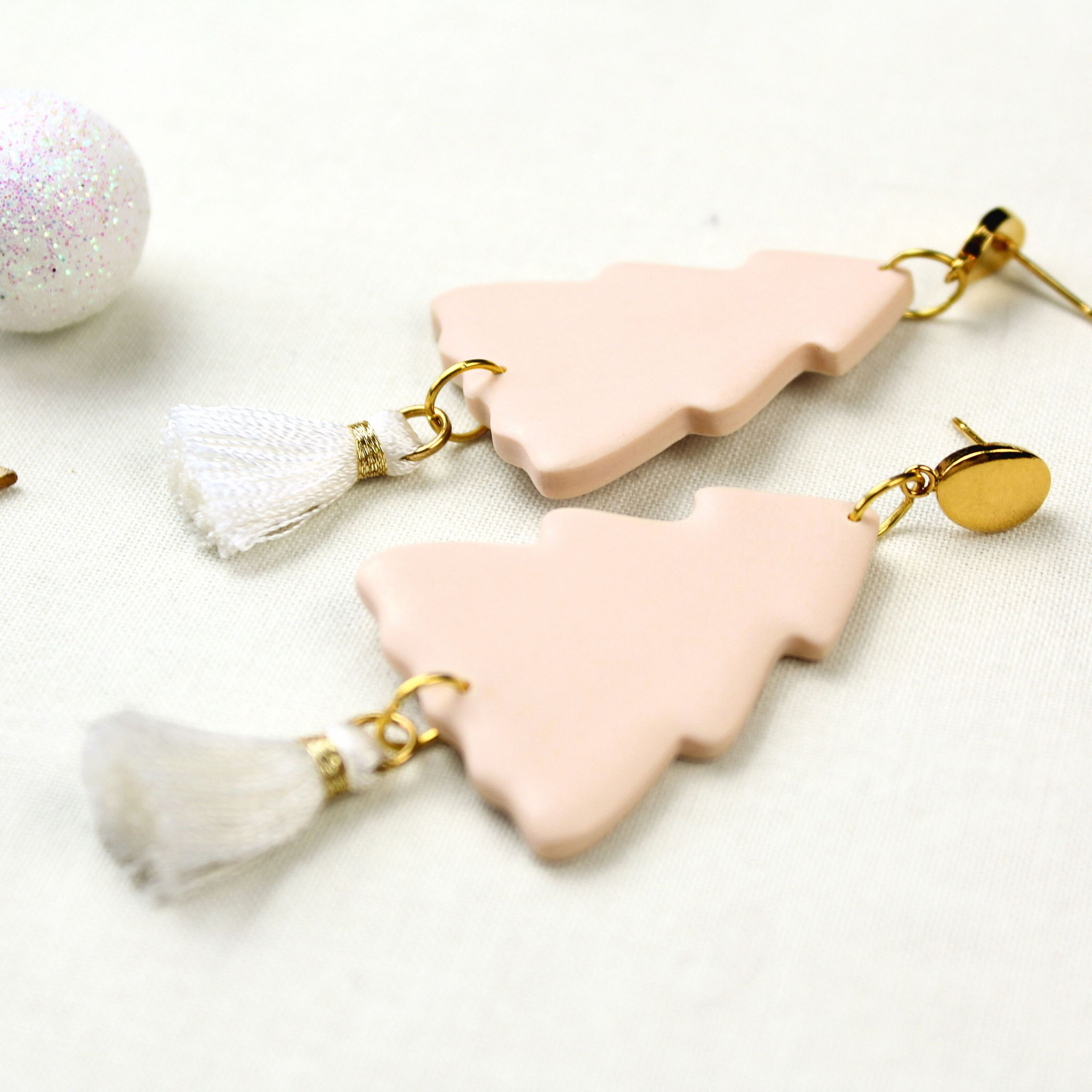 Zarte Rosa-Töne treffen auf goldene Details - Weihnachtsbaum Ohrhänger mit weißer Quaste, gefertigt aus Polymer Clay, Polyester und vergoldetem Edelstahl.